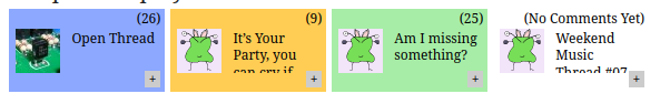 The next part of the page is a set of links to posts that the comments on the current view are attached to. The posts are color-coded. Comments — we’ll get there — use the same color code. In the box are: (1) the total number comments made on the post, in parentheses; (2) the title of the post, which is a link to that post’s page; and (3) the gravatar of the post’s author, if they have one (WordPress loves gravatars). Ignore the littler box with the plus sign, it’s an artifact left over from an earlier version.