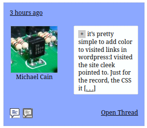 Then come 48 comment entries, each in its own box. Each box contains several parts. The topmost indicates how long ago the comment was submitted. There’s the gravatar of the comment author and the name they provided. If they filled out the website input when they submitted the comment, this name will be underlined and will be a link to that website. The white sub-box contains the first 25 or so words of the comment. The plus indicator will expand the box to show the full comment. The […] bit at the end will go to the post page, positioned at the comment. The post title in the lower right is a link to the post page, positioned at the top of the page. The little text balloons in the lower left are a bit more complicated.