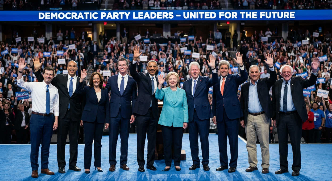 Create an image based on the names Barack Obama, Bernie Sanders, Bill Clinton, Cory Booker, Gavin Newsom, Hillary Clinton, Howard Dean, John Kerry, Kamala Harris, and Pete Buttigieg.