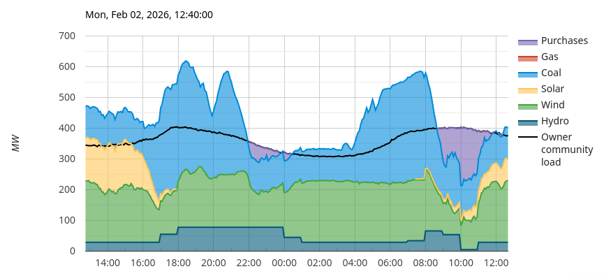 Here’s the fuel mix for my pissant little non-profit local power authority for the last 24 hours. 20 years ago it was, except for the same amount of hydro, all fossil fuels. The wind is from turbines built somewhere in the US. The solar is from panels built in Georgia. Another 100MW of solar comes online late this year, along with a 100MW 400MWh battery system. The batteries are from a Korean company’s US plant. For coal, 100MW is the minimum plant output that still allows for a warm start. The wholly-owned coal plant’s power is as cheap as the wind or solar because local circumstances, so gets dispatched by the balancing authority.