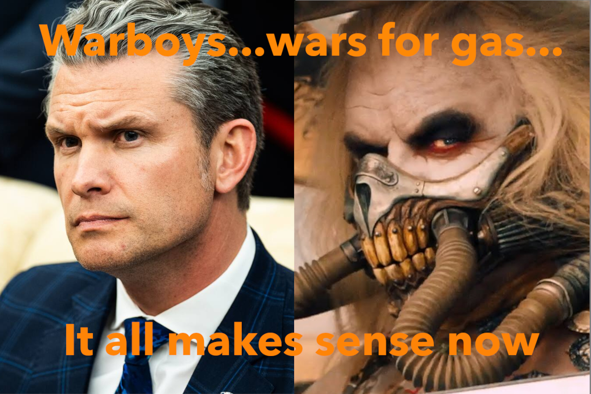 Hegseth is starting to give me an Immortan Joe vibe, which is fitting since we are on our way to Mad Max style fighting over petrol any day now.